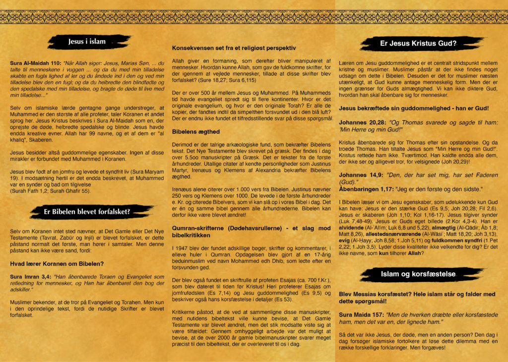 På 6 sider stilles spørgsmålet, hvem Jesus Kristus er i Koranen, og hvad Bibelen siger til sammenligning.